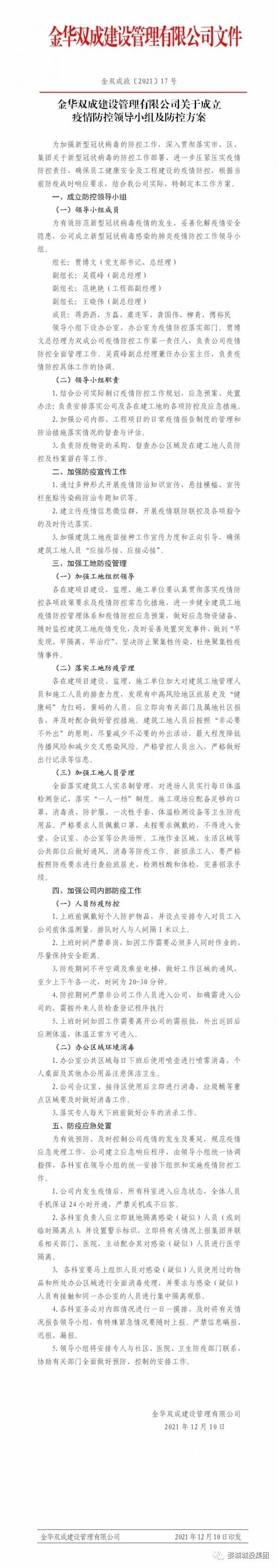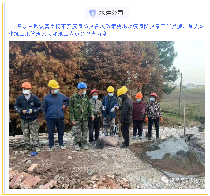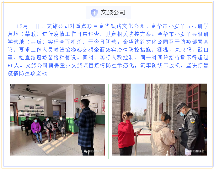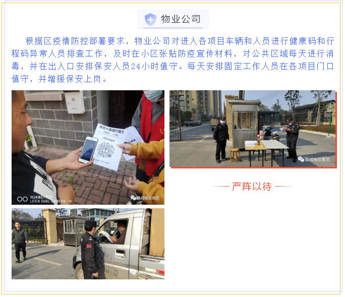 繼省、市、區(qū)疫情防控工作視頻會議召開后,婺城區(qū)城投集團(tuán)深刻認(rèn)識到疫情防控形勢的嚴(yán)峻性、復(fù)雜性、緊迫性,從“平時”模式轉(zhuǎn)入“戰(zhàn)時”機(jī)制,12月11日,集團(tuán)全面部署、立即落實(shí),第一時間印發(fā)《關(guān)于進(jìn)一步健全完善疫情防控工作體系的通知》,制定《金華市婺城區(qū)城鄉(xiāng)建設(shè)投資集團(tuán)有限公司疫情防控督查表》,在周末全員不休,集中精力開展重點(diǎn)項目和主要場所疫情防控攻堅的基礎(chǔ)上,組織其余干部職工前往聯(lián)系社區(qū),會同社區(qū)工作人員開展疫情防控工作,壓緊壓實(shí)責(zé)任,以鐵的擔(dān)當(dāng)、鐵的紀(jì)律對疫情防控工作進(jìn)行再細(xì)化、再落實(shí),一鼓作氣堅決打贏這場疫情防控阻擊戰(zhàn)。