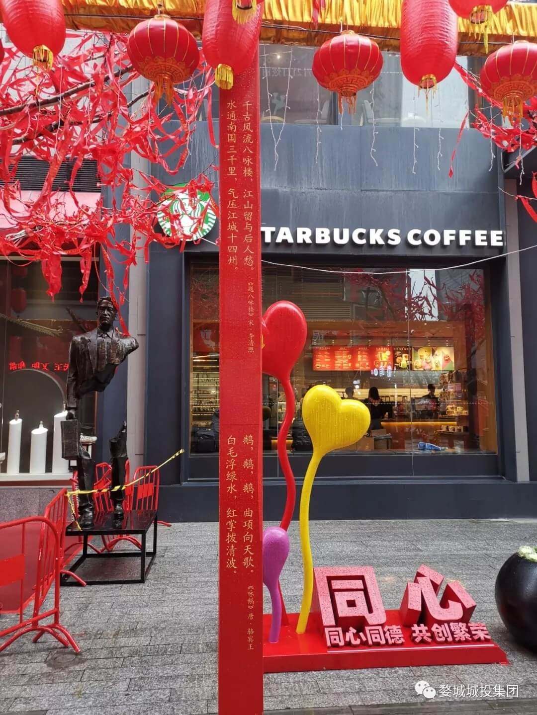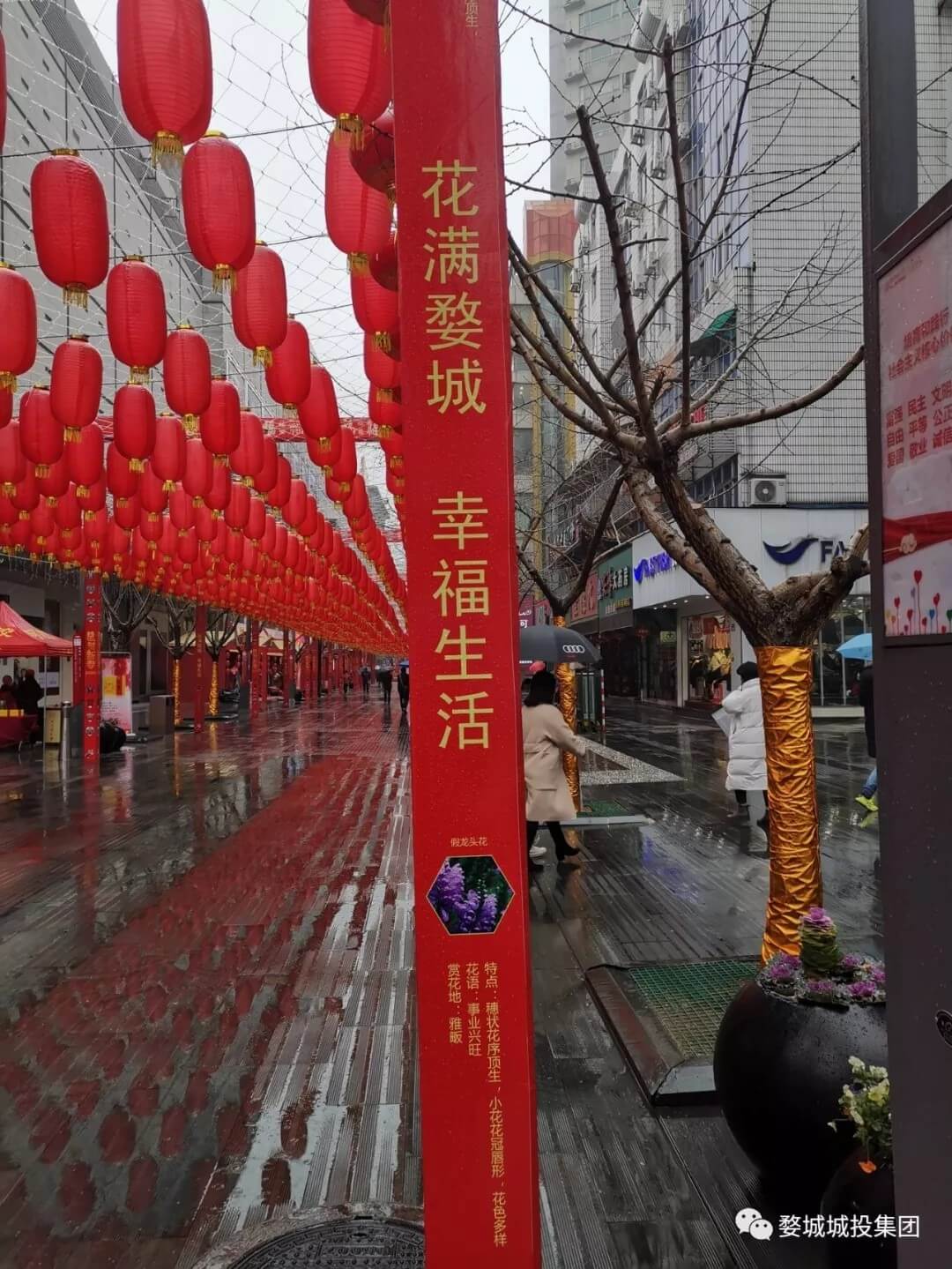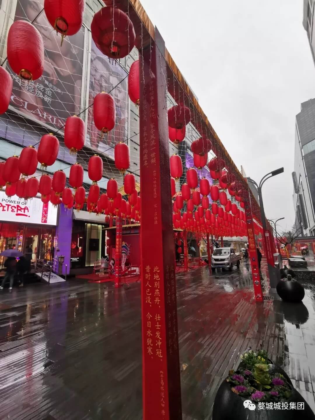 △勝利街迎春塑像喜慶祥和,火紅燈籠星羅棋布。